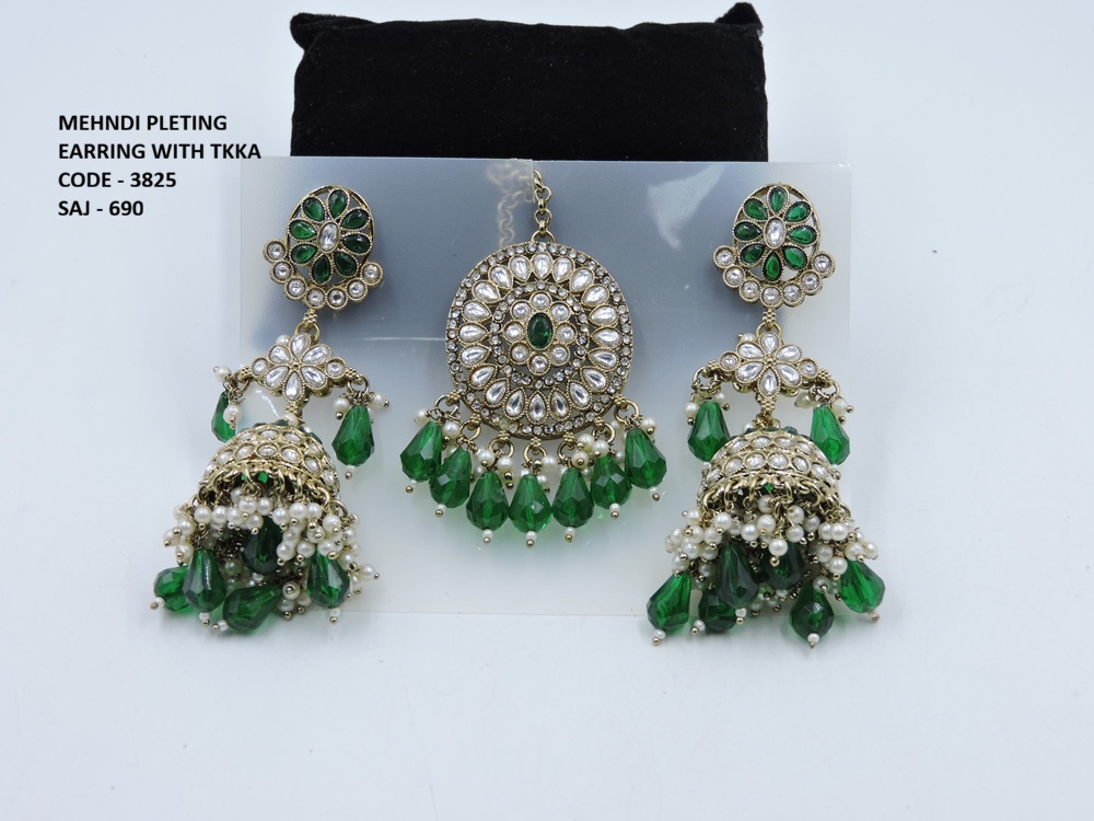 KUNDAN STONE MEHNDI POLISH EARRING WITH TIKKA
